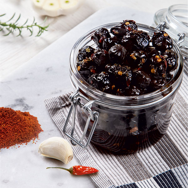 Olive nere dal colore scuro, caratterizzate da un dolce profumo simile alla mandorla ma dal retrogusto lievemente pungente.